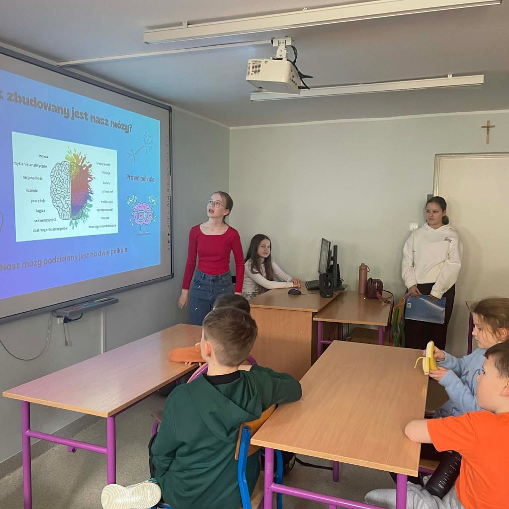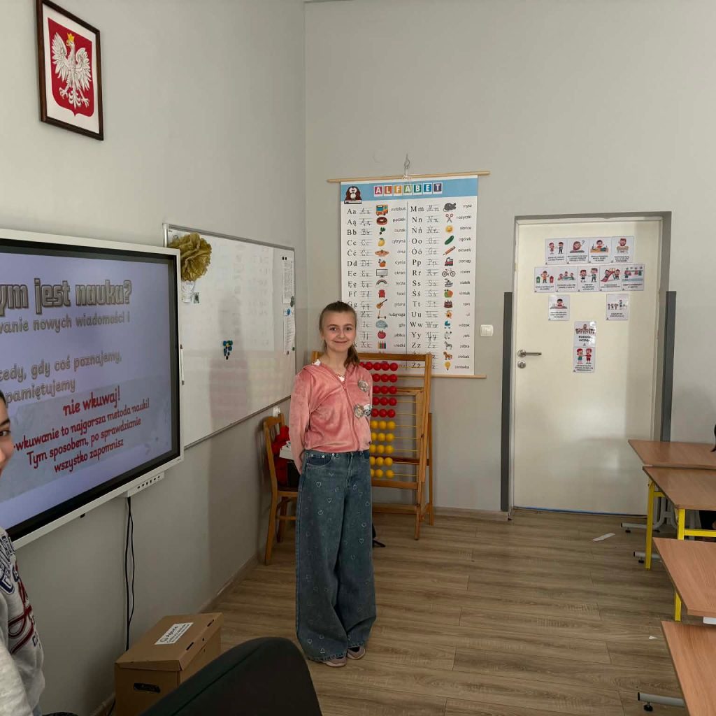 Następnie uczniowie zaprezentowali swoje materiały młodszym kolegom i koleżankom. Spotkania miały formę ciekawych i angażujących zajęć edukacyjnych, podczas których młodsi uczniowie mogli nie tylko wysłuchać prezentacji, ale również zadawać pytania oraz aktywnie uczestniczyć w rozmowie na temat sposobów skutecznego uczenia się.